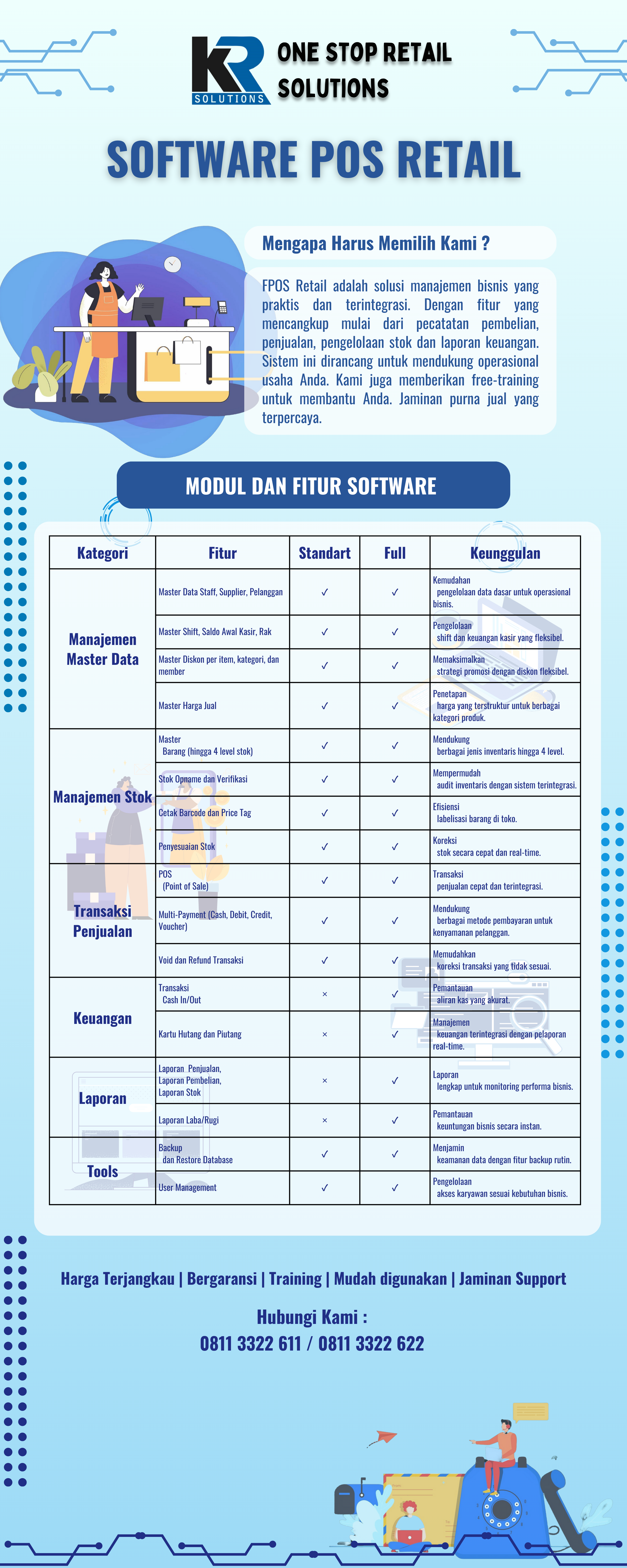 Untuk retail (toko bangunan, swalayan grosir, frozen food, tobaku) resto, apotek, koperasi simpan pinjam.