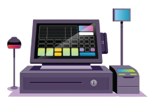 Set mesin kasir lengkap: desktop/touchscreen, barcode scanner, printer struk, printer barcode, laci kasir, PDT, dan aksesori lainnya.