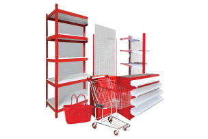 Rak gondola import/lokal, meja kasir, rak rokok, rak serbaguna, rak gudang, rak gondola kombinasi, keranjang tarik, jinjing, troley.